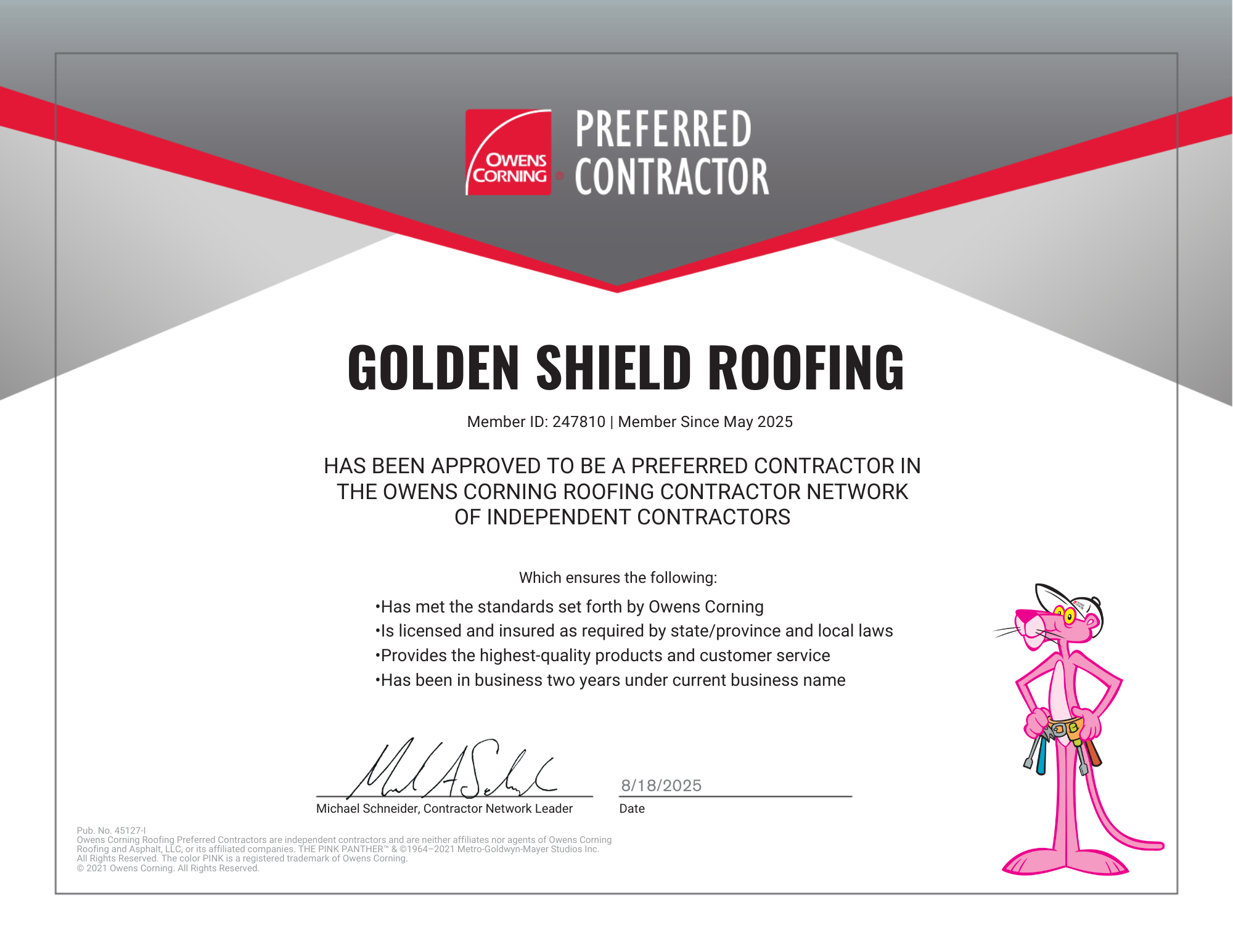 We are Gold level certified with Atlas, another roofing material manufacturer.